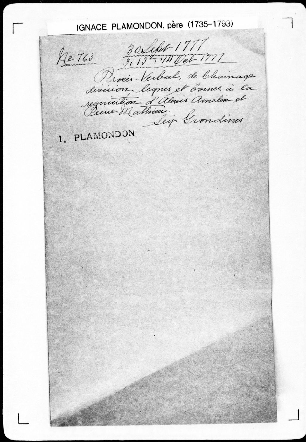 Procès-verbal de lignes de trois terres jusqu'à la terre du village, lesquelles terres étant situées dans la [seigneurie des Grondines]. La présente pièce concerne directement: Joseph Amelain (Hamelin), neveu d'Alexis Hamelin; Jean-Baptiste Sovageau (Sauvageau); [Alexis] Amelain (Hamelin), oncle de Joseph Hamelin (arpenteur Ignace Plamondon père), 3 octobre 1777 - 4 octobre 1777, Archives nationales à Québec, Fonds Cour supérieure. District judiciaire de Québec. Greffes d'arpenteurs, (03Q,CA301,S43,P763-2).