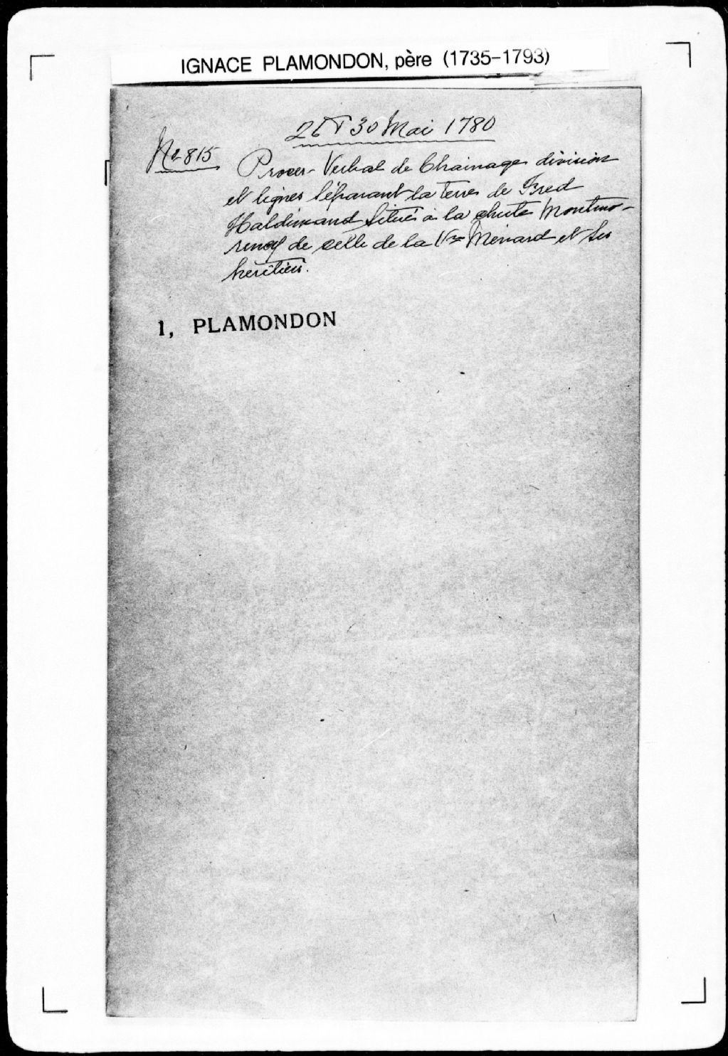 Procès-verbal de bornes séparant deux terres, par ordre de Son Excellence le général Haldimand, lesquelles terres étant situées entre le fleuve Saint-Laurent et le saut Montmorency, dans la [seigneurie de Beauport]. La présente pièce concerne directement: [Frédérick] Haldimand, [gouverneur général de la province de Québec]; la veuve Ménard (arpenteur Ignace Plamondon père), 30 mai 1780, Archives nationales à Québec, Fonds Cour supérieure. District judiciaire de Québec. Greffes d'arpenteurs, (03Q,CA301,S43,P815-2).