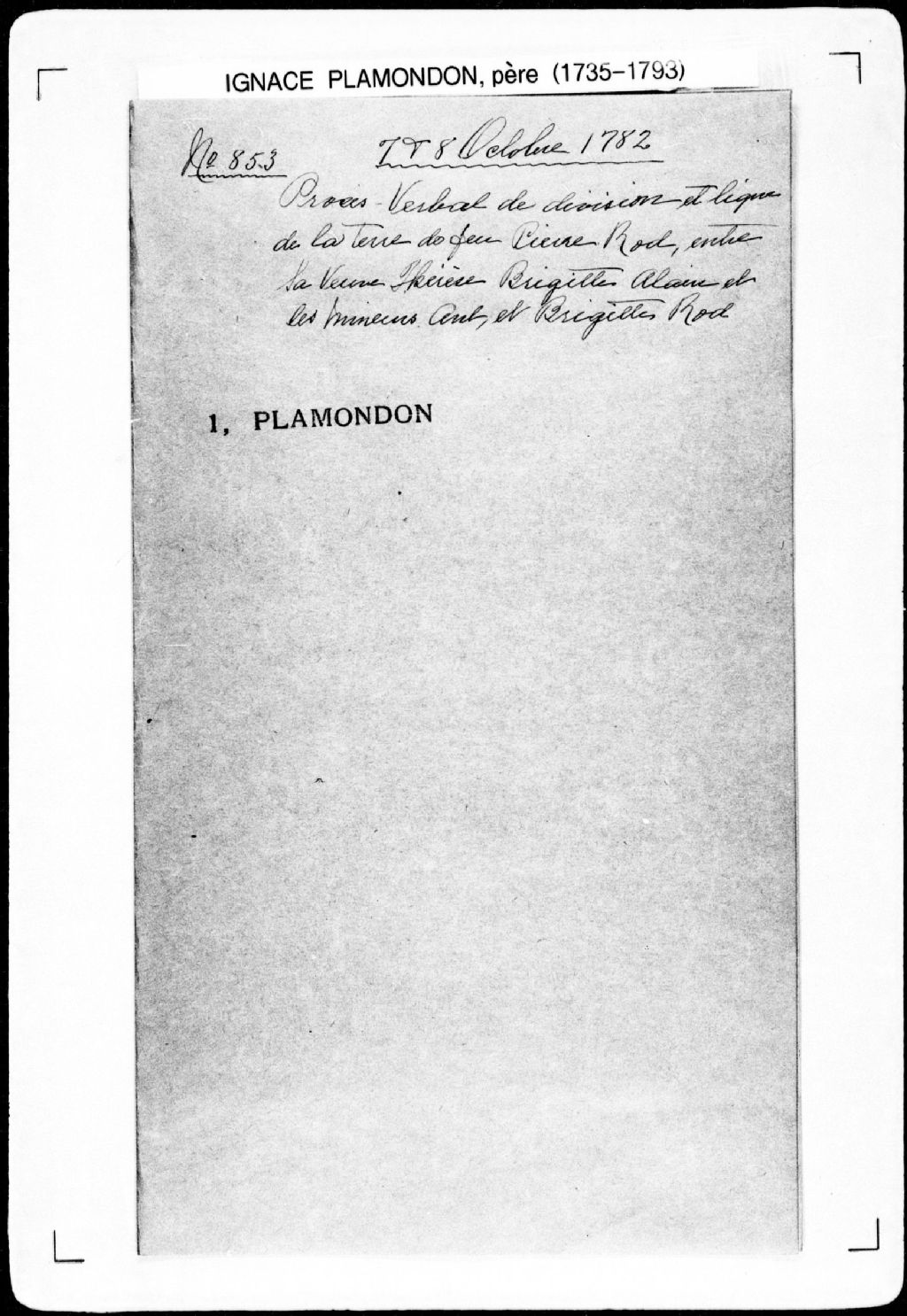 Procès-verbal de chaînage et bornes d'un emplacement situé sur la route de Lormière, au nord-est de ladite route, dans la seigneurie de Saint-Gabriel. La présente pièce concerne directement: Pierre Lebeuf (Leboeuf) (arpenteur Ignace Plamondon père), 8 octobre 1782, Archives nationales à Québec, Fonds Cour supérieure. District judiciaire de Québec. Greffes d'arpenteurs, (03Q,CA301,S43,P853-2).