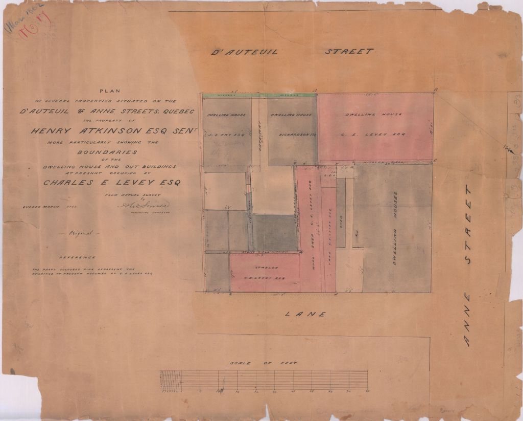 Plan of several properties situated on the D'Auteuil & Anne streets, Quebec, the property of Henry Atkinson père more particularly shewing the boundaries of the dwelling house and out buildings at present occupied by Charles E. Levey