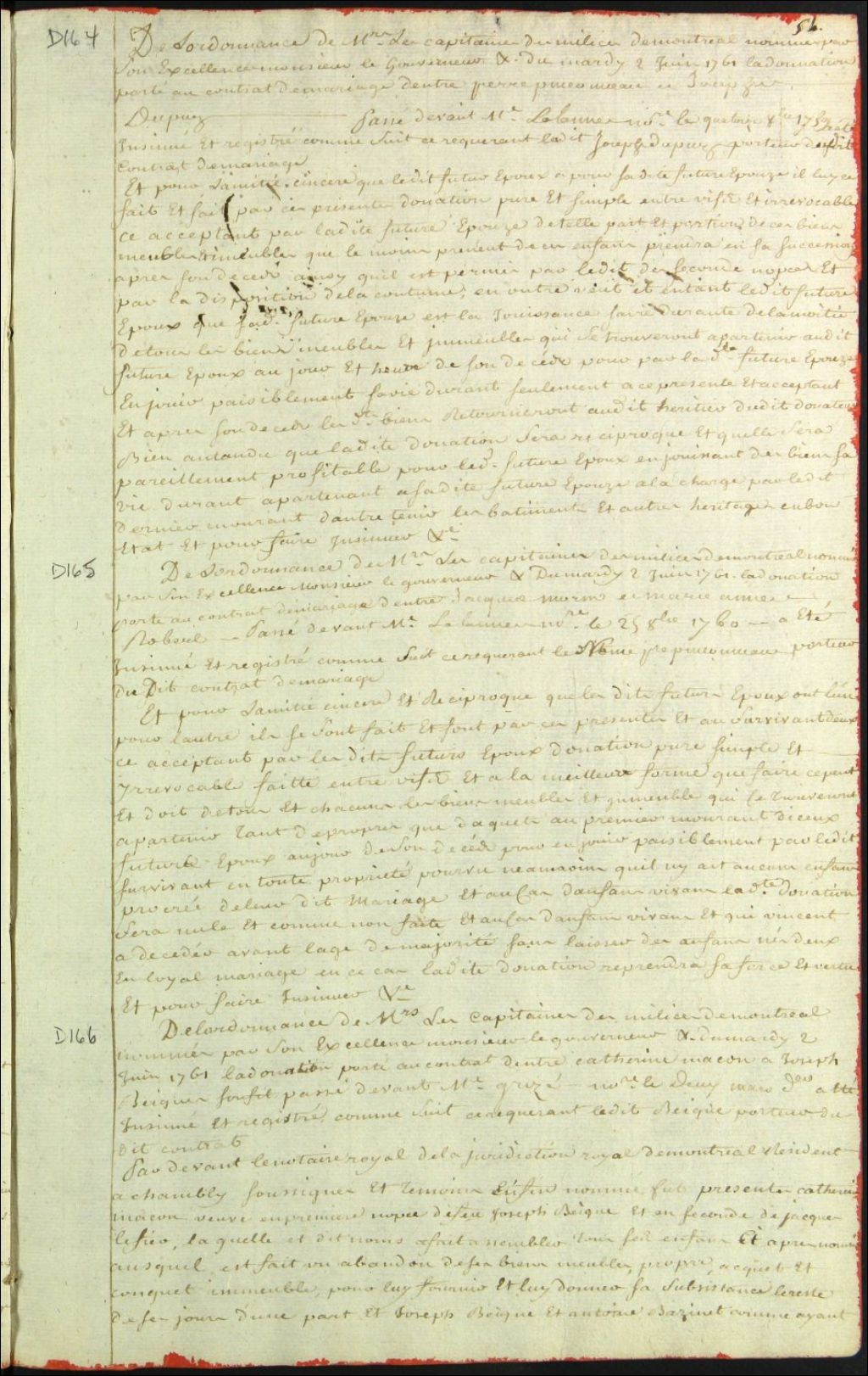 Insinuation de la donation portée au contrat entre Catherine Masson et Joseph Béïque son fils, 2 juin 1761, Archives nationales à Montréal, Fonds Cour supérieure. District judiciaire de Montréal. Procédures en matières non contentieuses, (06M,CP601,S4,SS1,D166).
