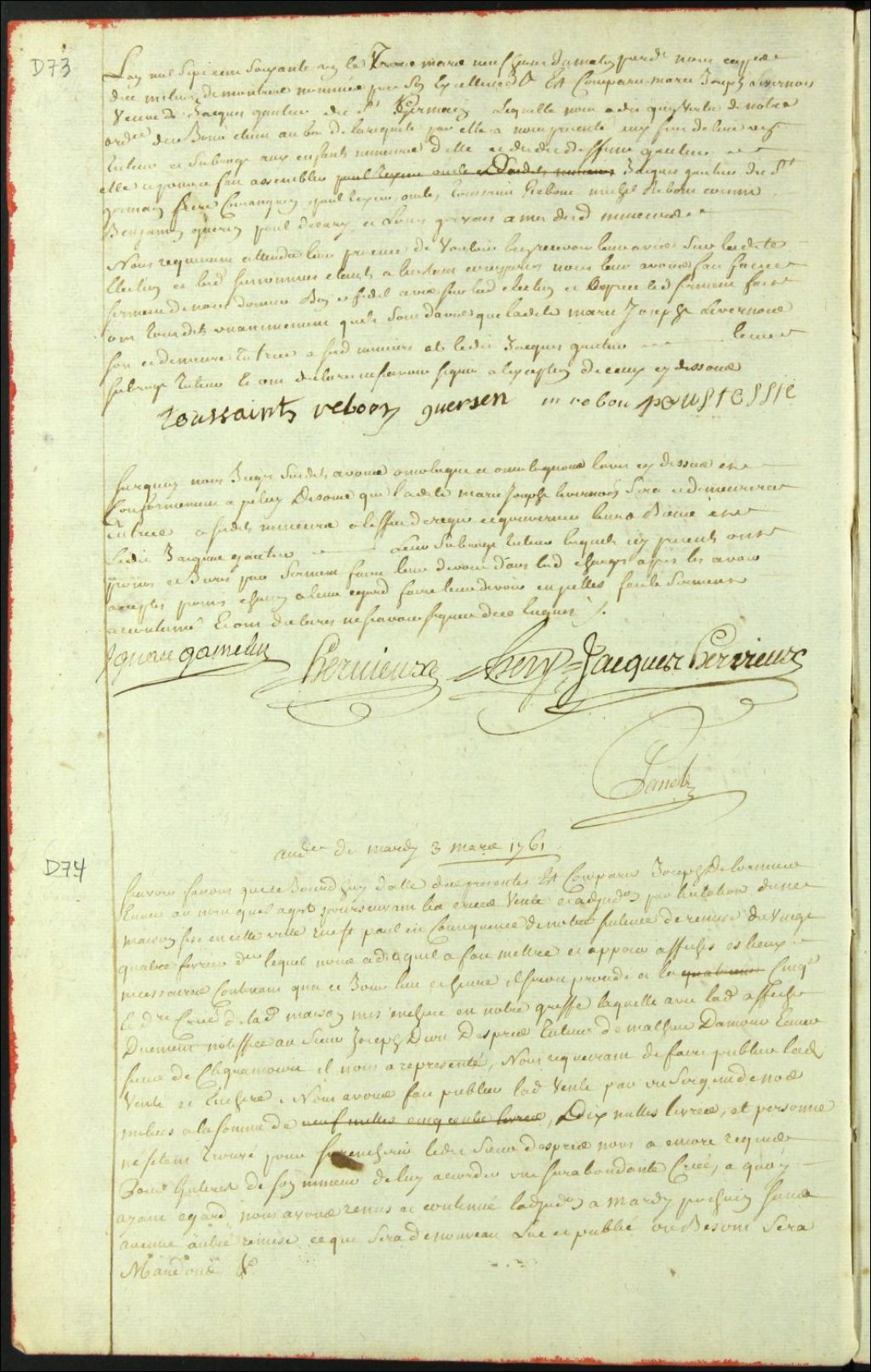 Vente par licitation de la maison dépendant de la succession des défunts [Louis Mathieu Damour Declignancourt et Marie Madeleine Guyon Després Dion], 3 mars 1761, Archives nationales à Montréal, Fonds Cour supérieure. District judiciaire de Montréal. Procédures en matières non contentieuses, (06M,CP601,S4,SS1,D74).