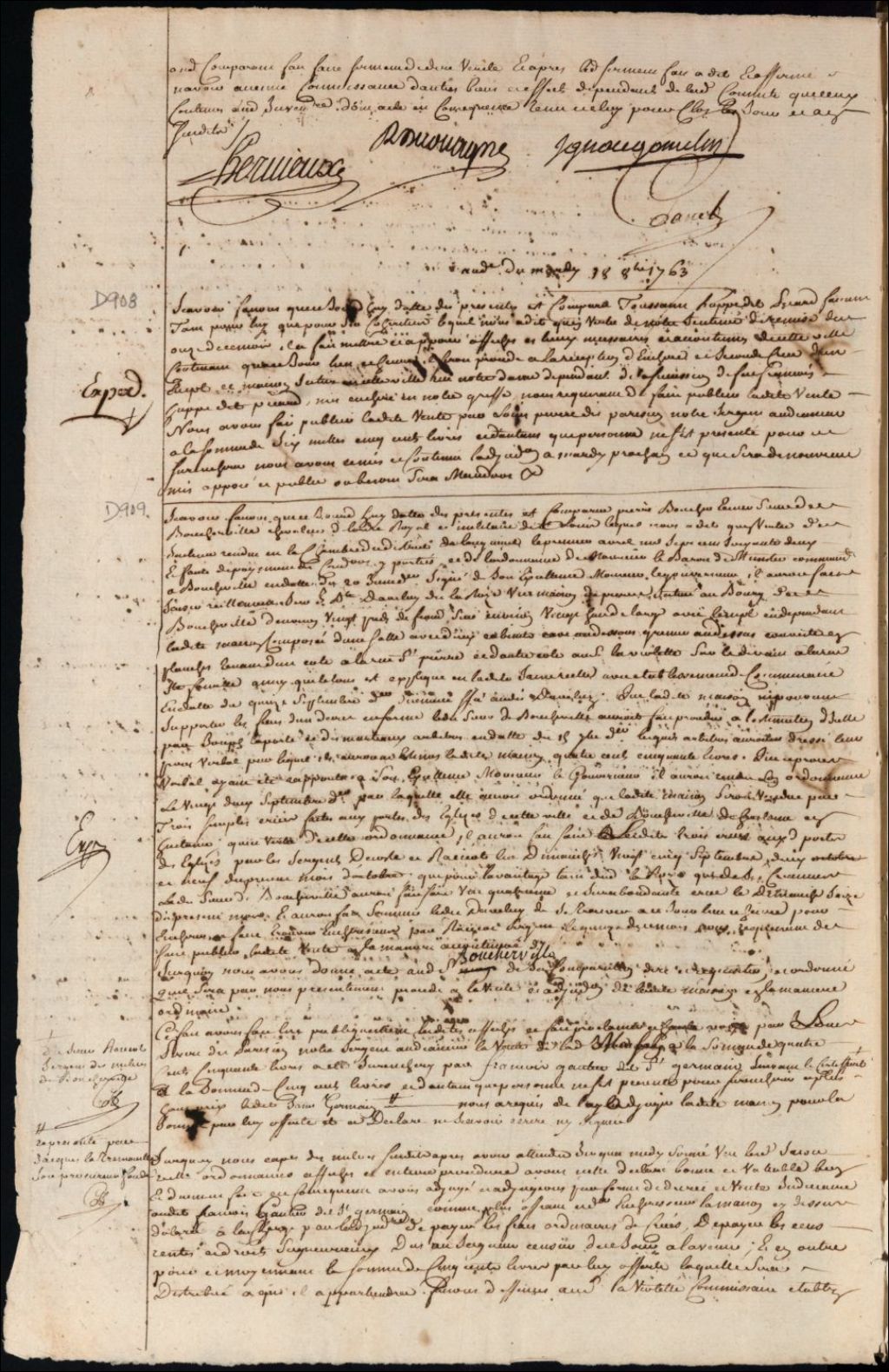 Vente par licitation d'un emplacement et maison dependant de la succession de feu François [Huppé] Picard situés rue Notre-Dame à Montréal, 18 octobre 1763, Archives nationales à Montréal, Fonds Cour supérieure. District judiciaire de Montréal. Procédures en matières non contentieuses, (06M,CP601,S4,SS1,D908).