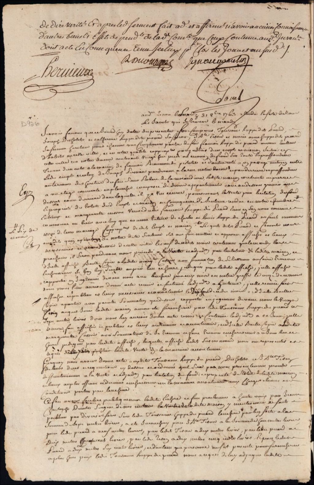 Vente par licitation d'un emplacement et maison dependant de la succession de feu François Huppé Picard situés rue Notre-Dame à Montréal, 31 octobre 1763, Archives nationales à Montréal, Fonds Cour supérieure. District judiciaire de Montréal. Procédures en matières non contentieuses, (06M,CP601,S4,SS1,D926).