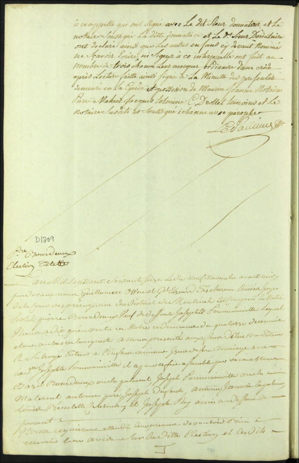 Tutelle de l'enfant mineur de feu Marie Josèphe [Brault] Pominville et de Pierre Bourdeau, 19 novembre 1776, Archives nationales à Montréal, Fonds Cour supérieure. District judiciaire de Montréal. Procédures en matières non contentieuses, (06M,CP601,S5,D1209).