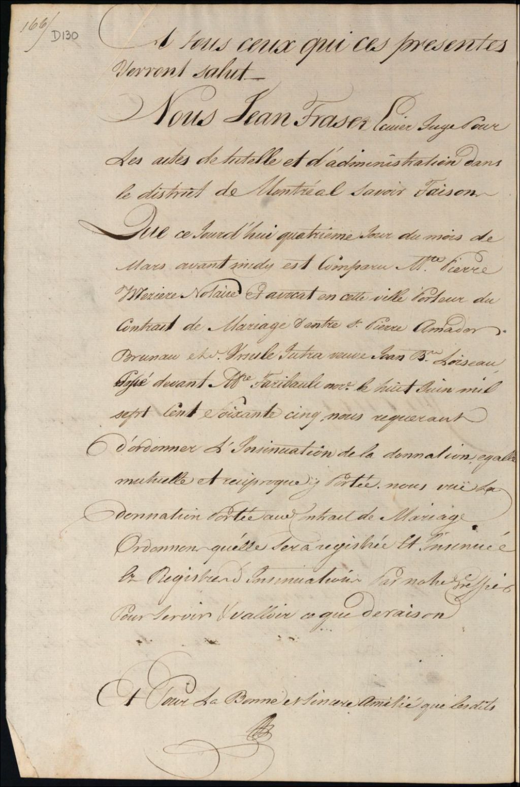 Insinuation de la donation portée au contrat de mariage entre Pierre Amadon Bruneau et Ursule Jutras, 4 mars 1769, Archives nationales à Montréal, Fonds Cour supérieure. District judiciaire de Montréal. Procédures en matières non contentieuses, (06M,CP601,S5,D130).