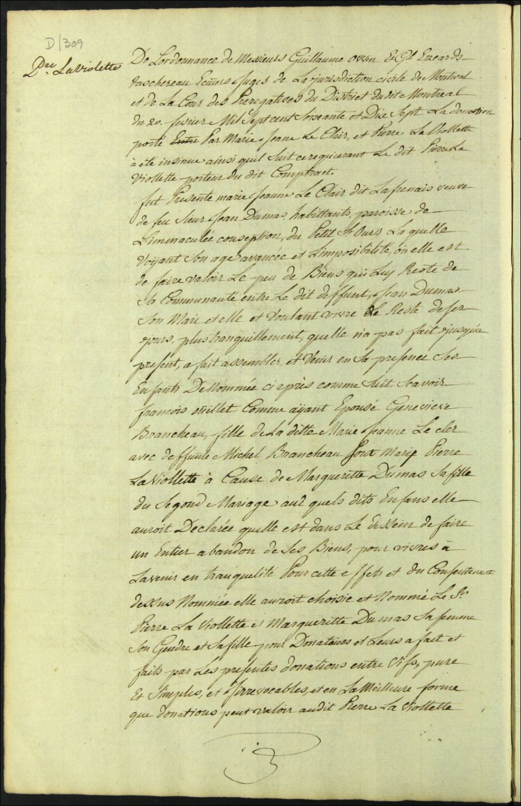 - Insinuation de la donation de Marie Jeanne Leclerc, veuve de Jean Dumas, à sa fille et son gendre, Marguerite Dumas et Pierre Laviolette
