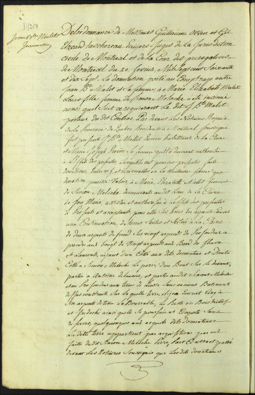 Insinuation de la donation portée au contrat entre Jean Baptiste Mallet et son épouse, et leur fille Marie Élisabeth Mallet, épouse de Simon Meloche, 20 février 1777, Archives nationales à Montréal, Fonds Cour supérieure. District judiciaire de Montréal. Procédures en matières non contentieuses, (06M,CP601,S5,D1317).