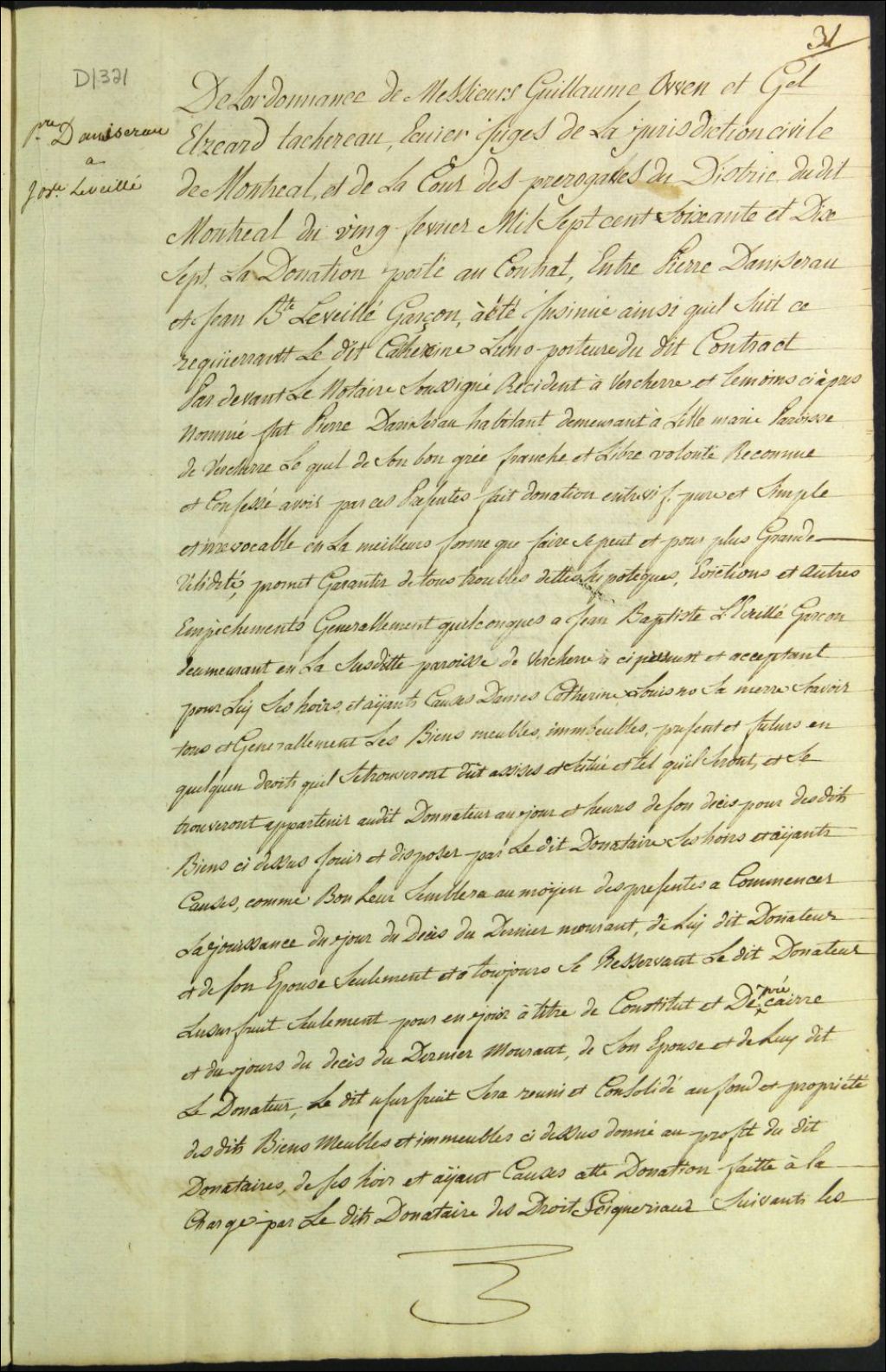 Insinuation de la donation portée au contrat entre Pierre Dansereau et Jean Baptiste Léveillé, 20 février 1777, Archives nationales à Montréal, Fonds Cour supérieure. District judiciaire de Montréal. Procédures en matières non contentieuses, (06M,CP601,S5,D1321).