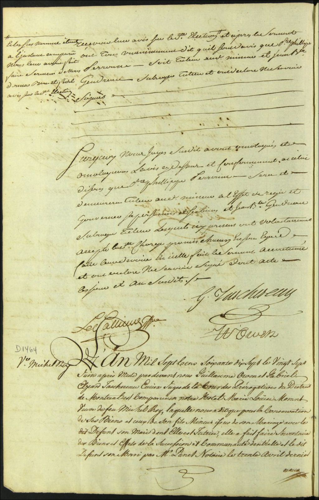 Clôture d'inventaire des biens de la succession et de la communauté de feu Michel Roy et Marie Louise Morand, 27 juin 1777, Archives nationales à Montréal, Fonds Cour supérieure. District judiciaire de Montréal. Procédures en matières non contentieuses, (06M,CP601,S5,D1464).
