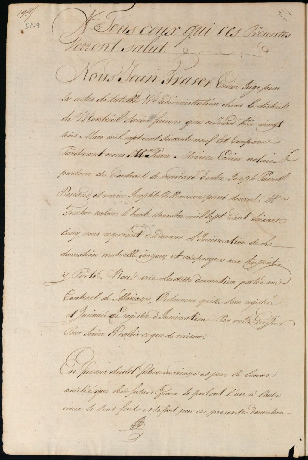 Insinuation de la donation portée au contrat de mariage entre Joseph Pascal Renaud et Marie Josèphe Villeneuve, 23 mars 1769, Archives nationales à Montréal, Fonds Cour supérieure. District judiciaire de Montréal. Procédures en matières non contentieuses, (06M,CP601,S5,D149).