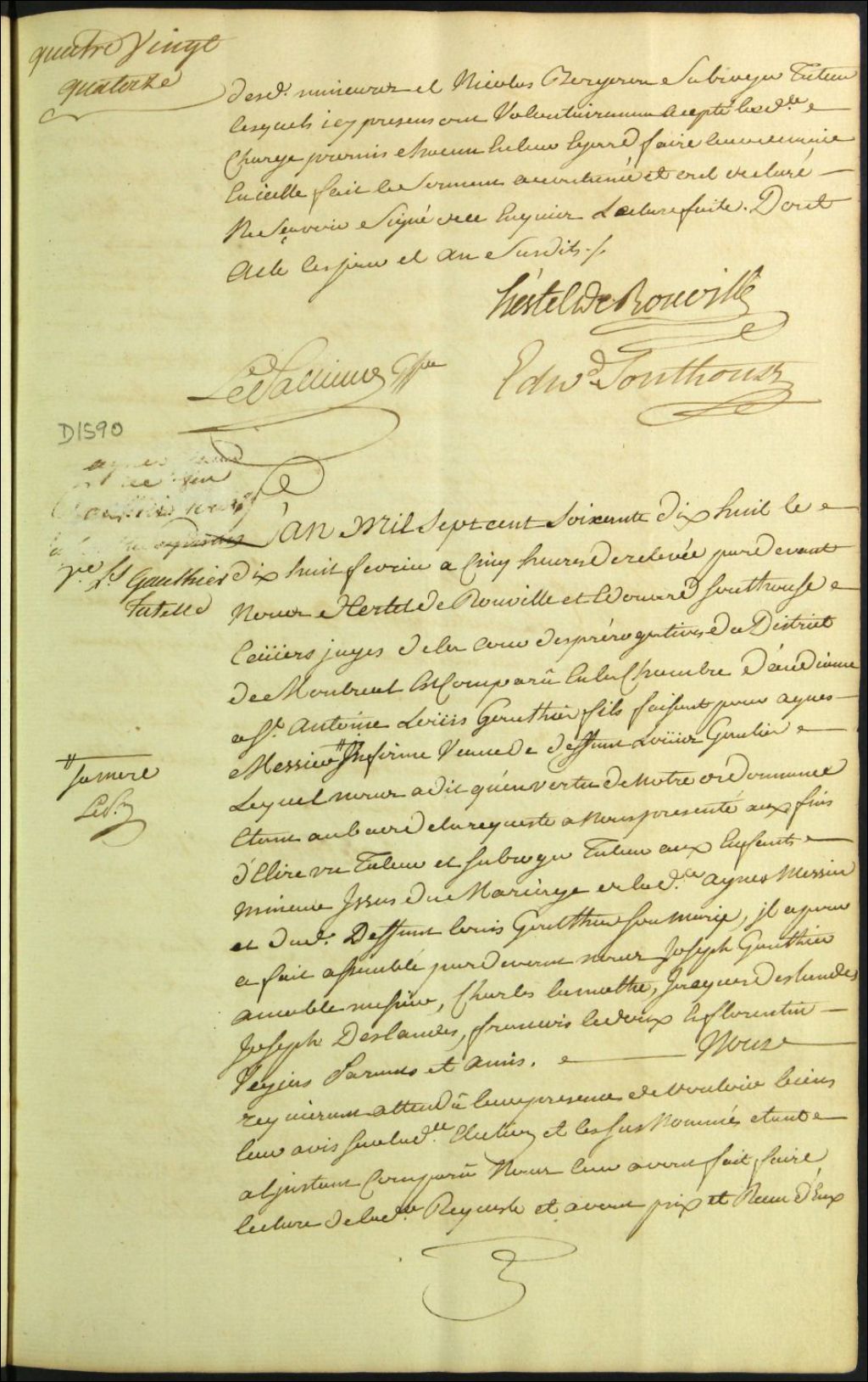 Tutelle des enfants mineurs de feu Louis Gauthier et d'Agnès Messier, 18 février 1778, Archives nationales à Montréal, Fonds Cour supérieure. District judiciaire de Montréal. Procédures en matières non contentieuses, (06M,CP601,S5,D1590).