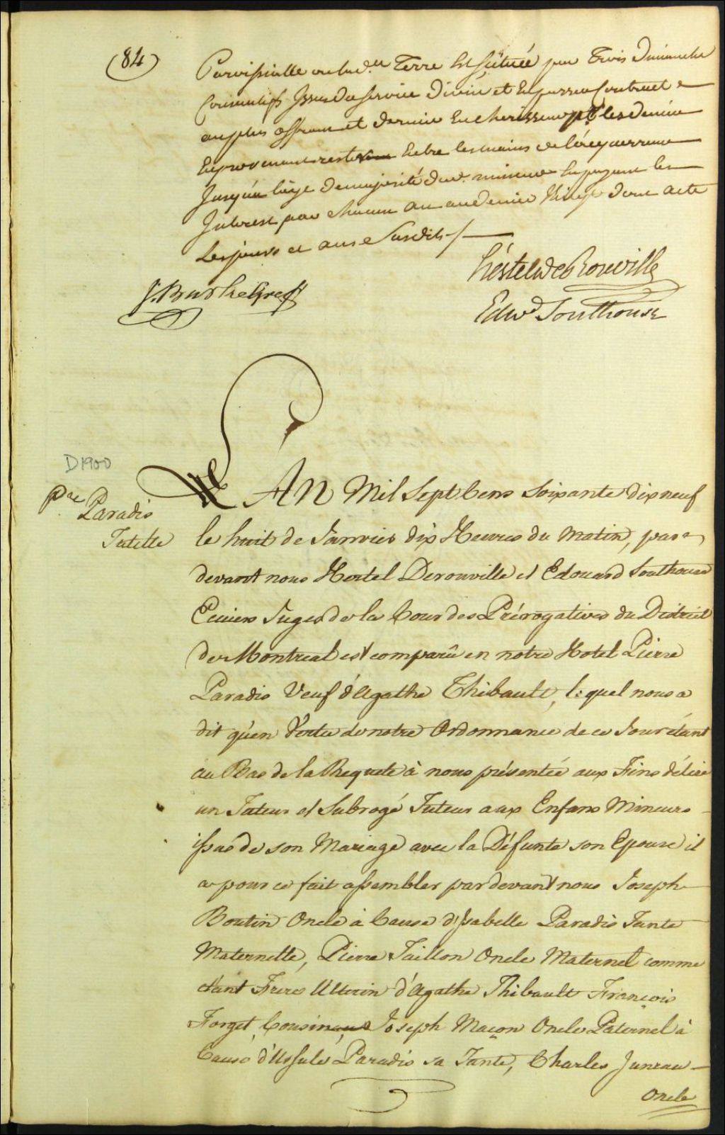 Tutelle des enfants mineurs de feu Agathe Thibault et de Pierre Paradis, 8 janvier 1779, Archives nationales à Montréal, Fonds Cour supérieure. District judiciaire de Montréal. Procédures en matières non contentieuses, (06M,CP601,S5,D1900).