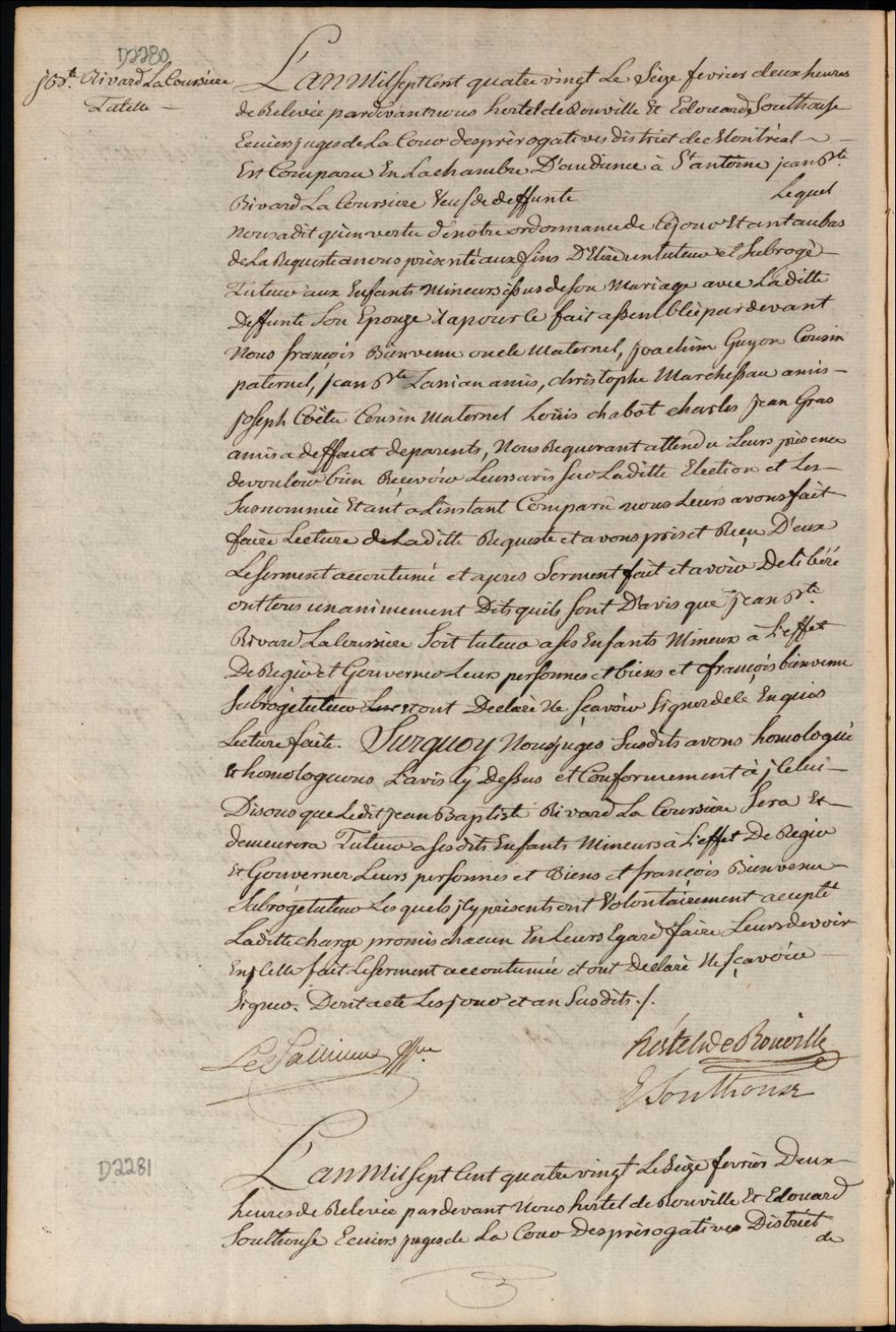 Tutelle des enfants mineurs de feu Marguerite Émery et de Joseph Marcoux, 16 février 1780, Archives nationales à Montréal, Fonds Cour supérieure. District judiciaire de Montréal. Procédures en matières non contentieuses, (06M,CP601,S5,D2281).