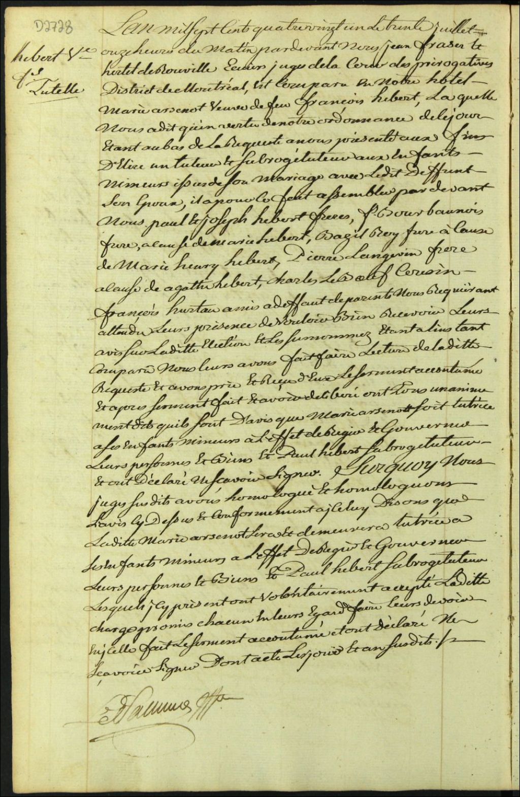 Tutelle des enfants mineurs de feu François Hébert et Marie Arsenault, 30 juillet 1781, Archives nationales à Montréal, Fonds Cour supérieure. District judiciaire de Montréal. Procédures en matières non contentieuses, (06M,CP601,S5,D2728).