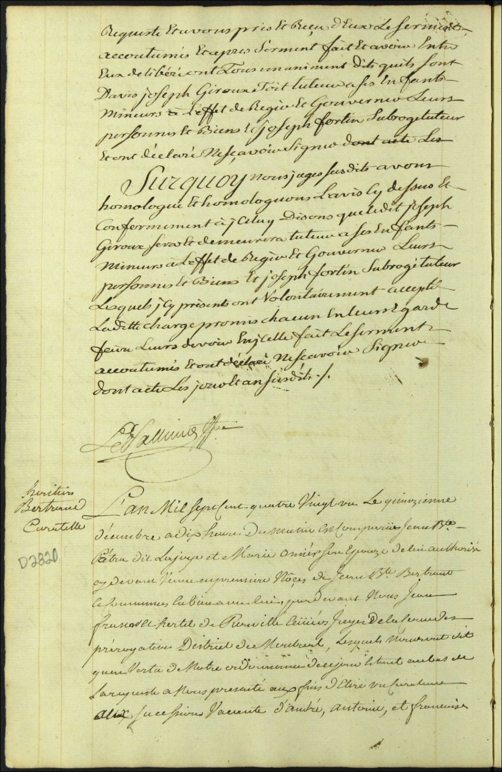 Curatelle de la succession vacante d'André Bertrand, Antoine Bertrand et Françoise Bertrand, enfants absents de la province de feu Jean Baptiste Bertrand et Marie [H]Omier, 15 décembre 1781, Archives nationales à Montréal, Fonds Cour supérieure. District judiciaire de Montréal. Procédures en matières non contentieuses, (06M,CP601,S5,D2820).