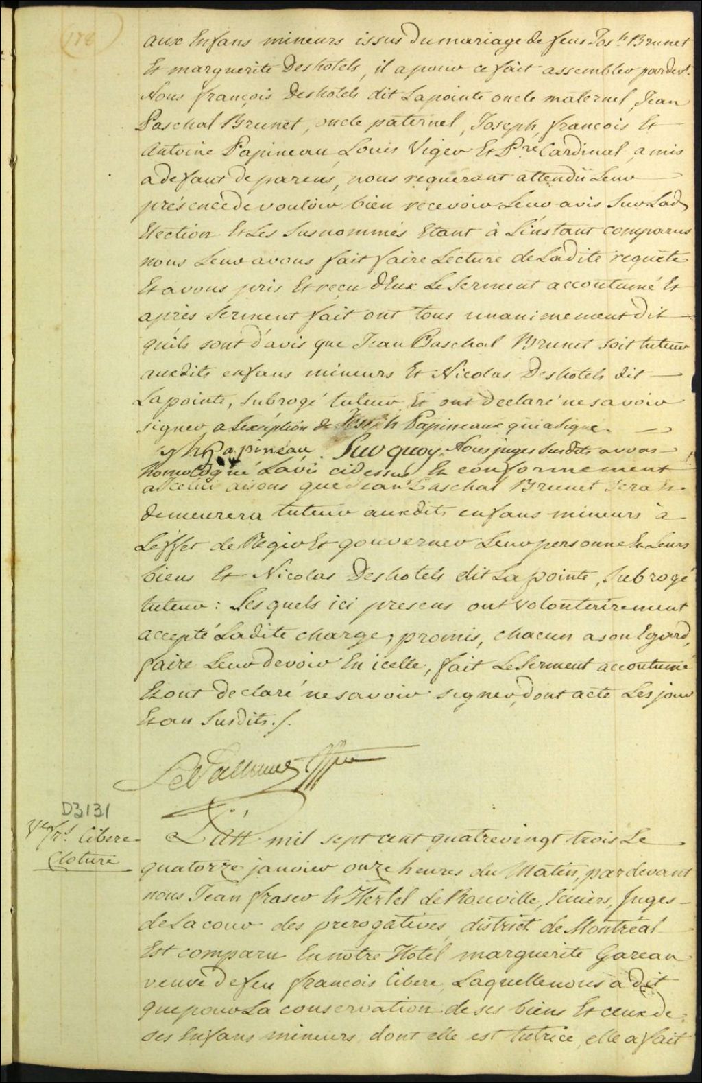 Clôture d'inventaire des biens de la succession et de la communauté de feu François Cibere [François Cibert] et Marguerite Gareau, 14 janvier 1783, Archives nationales à Montréal, Fonds Cour supérieure. District judiciaire de Montréal. Procédures en matières non contentieuses, (06M,CP601,S5,D3131).