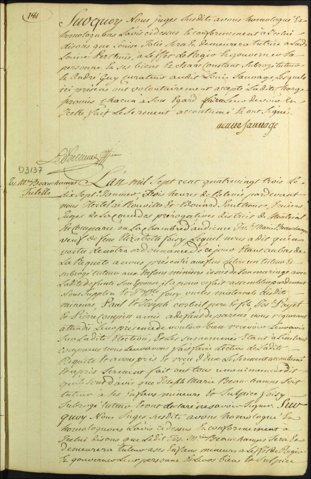 Tutelle des enfants mineurs de feu Élisabeth Foisy et Joseph Marie Beauchamp, 17 janvier 1783, Archives nationales à Montréal, Fonds Cour supérieure. District judiciaire de Montréal. Procédures en matières non contentieuses, (06M,CP601,S5,D3137).