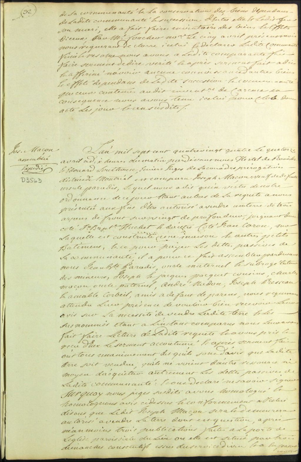Tutelle des enfants mineurs de feu Ursule Paradis et Josèphe Maçon [Josèphe Masson] - Administration tutélaire, 14 avril 1784, Archives nationales à Montréal, Fonds Cour supérieure. District judiciaire de Montréal. Procédures en matières non contentieuses, (06M,CP601,S5,D3563).