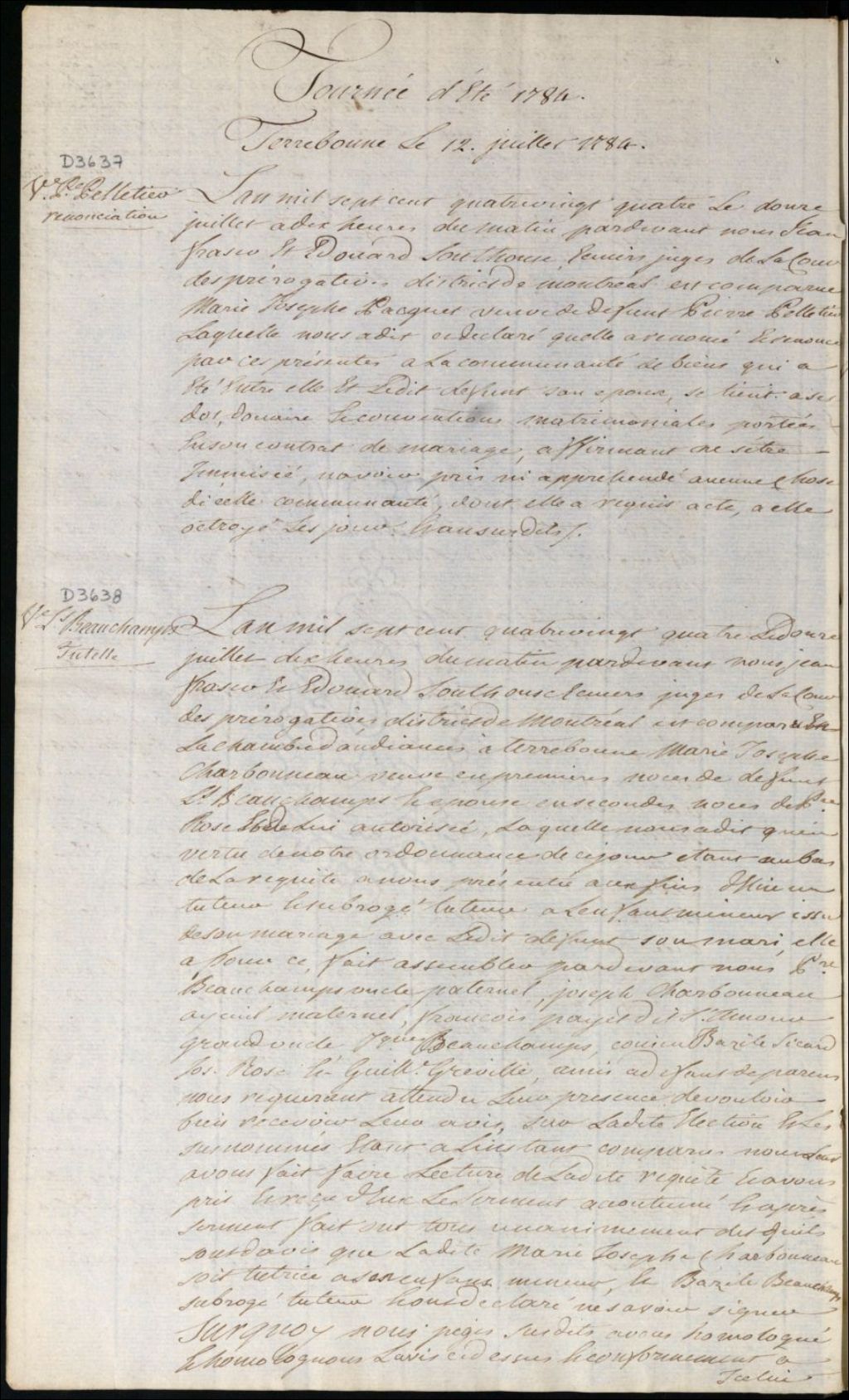 Tutelle de l'enfant mineur de feu Louis Beauchamp et Marie Josèphe Charbonneau, 12 juillet 1784, Archives nationales à Montréal, Fonds Cour supérieure. District judiciaire de Montréal. Procédures en matières non contentieuses, (06M,CP601,S5,D3638).