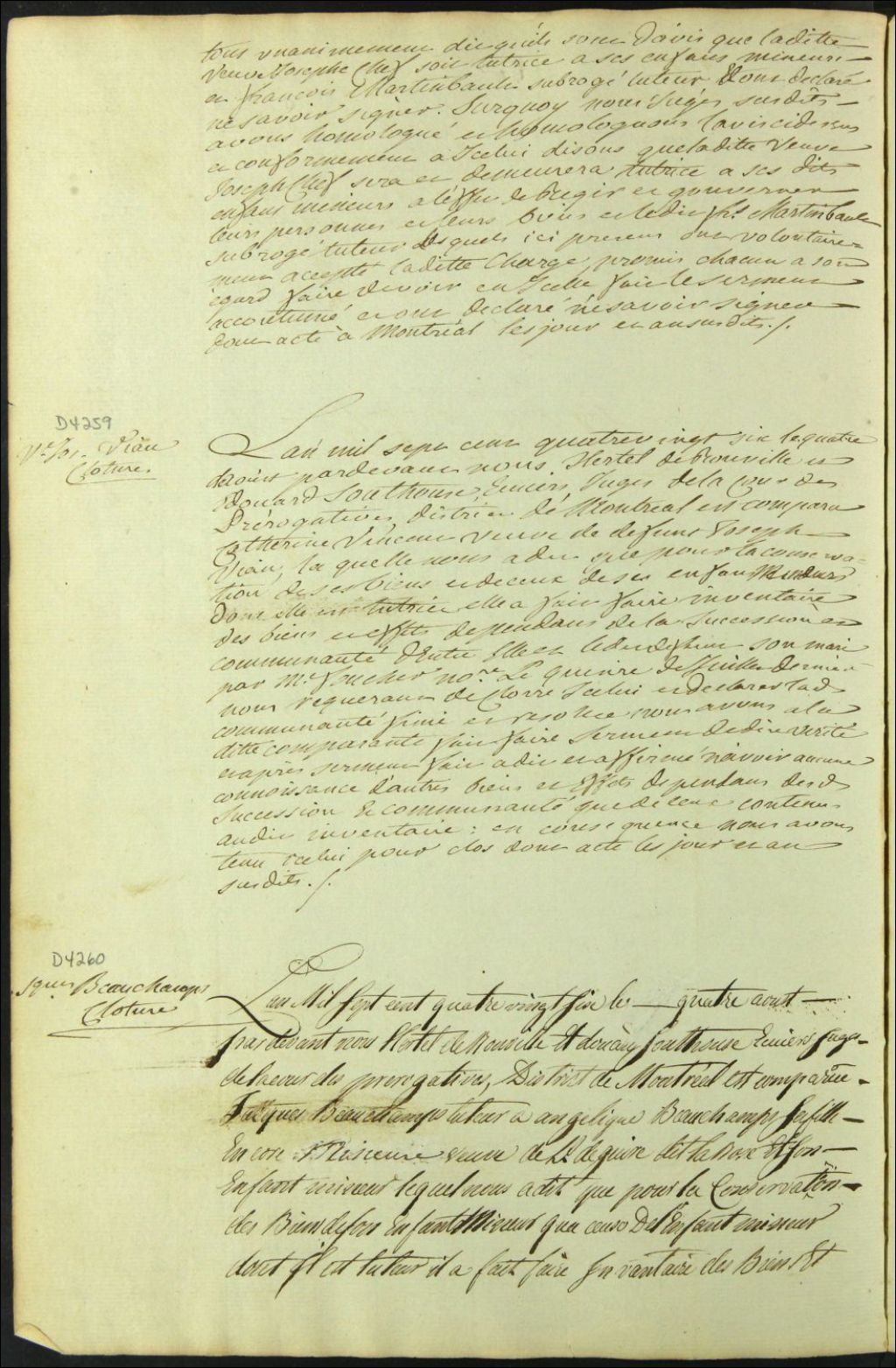 Clôture d'inventaire des biens de la succession et de la communauté de feu Louis Deguire Larose et Angélique [Marie Josèphe] Beauchamp, 4 août 1786, Archives nationales à Montréal, Fonds Cour supérieure. District judiciaire de Montréal. Procédures en matières non contentieuses, (06M,CP601,S5,D4260).