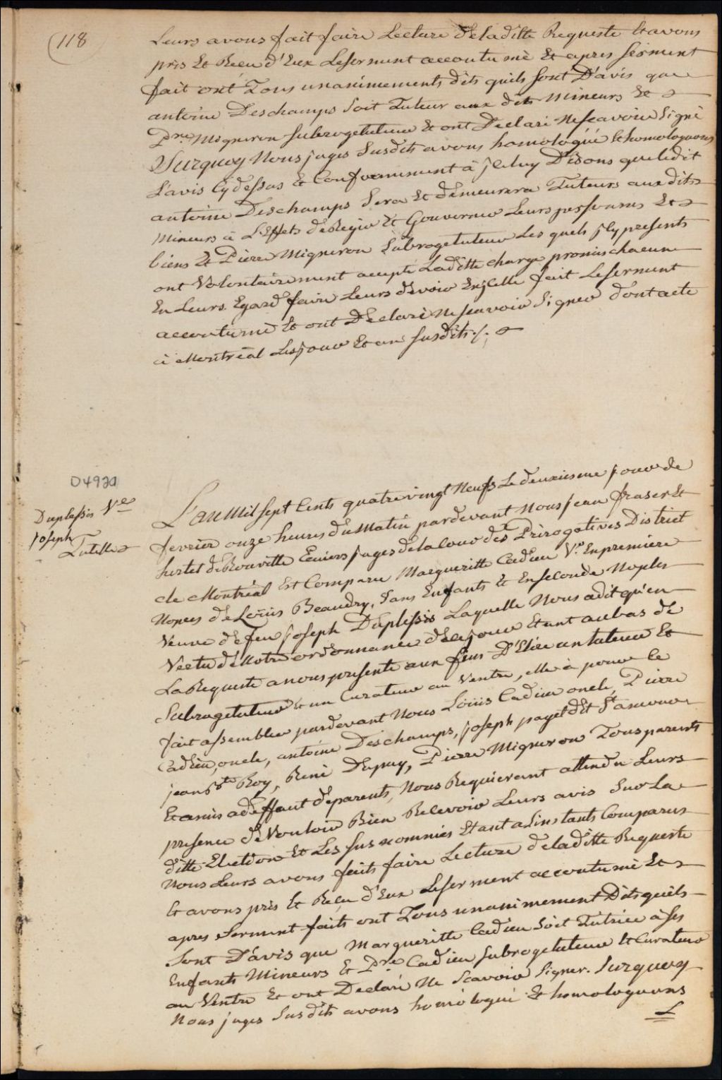 Tutelle des enfants mineurs curatelle de l'enfant posthume (curatelle au ventre) de feu Joseph Duplessis et de Louis Beaudry, 2 février 1789, Archives nationales à Montréal, Fonds Cour supérieure. District judiciaire de Montréal. Procédures en matières non contentieuses, (06M,CP601,S5,D4920).