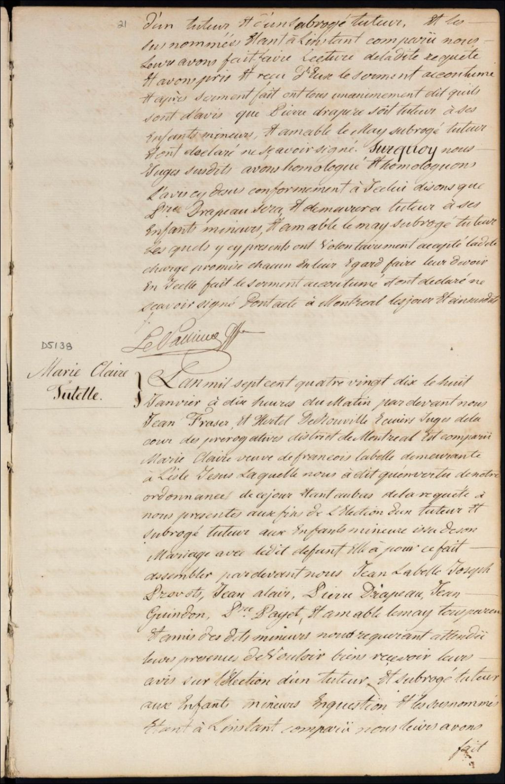Tutelle des enfants mineurs de feu François Labelle et de Marie Claire [Prévost], 8 janvier 1790, Archives nationales à Montréal, Fonds Cour supérieure. District judiciaire de Montréal. Procédures en matières non contentieuses, (06M,CP601,S5,D5138).