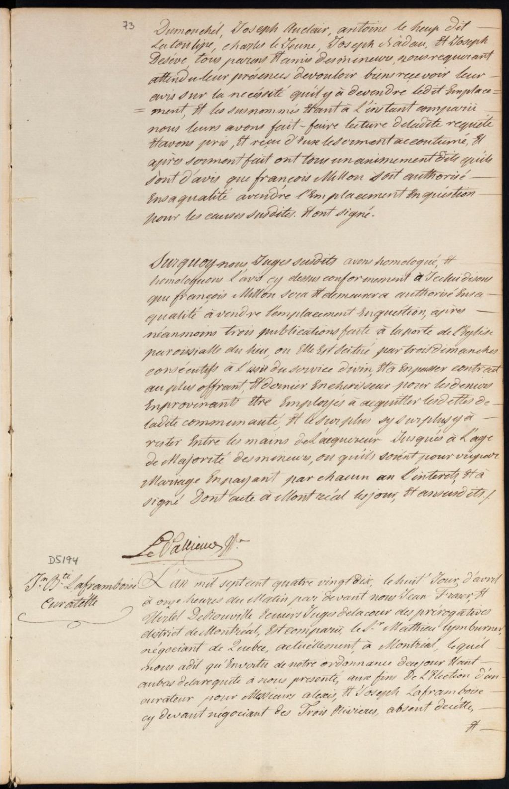 Curatelle d'Alexis Laframboise et de Joseph Laframboise absents de la province pour la succession de feu Jean Baptiste Laframboise, 8 avril 1790, Archives nationales à Montréal, Fonds Cour supérieure. District judiciaire de Montréal. Procédures en matières non contentieuses, (06M,CP601,S5,D5194).