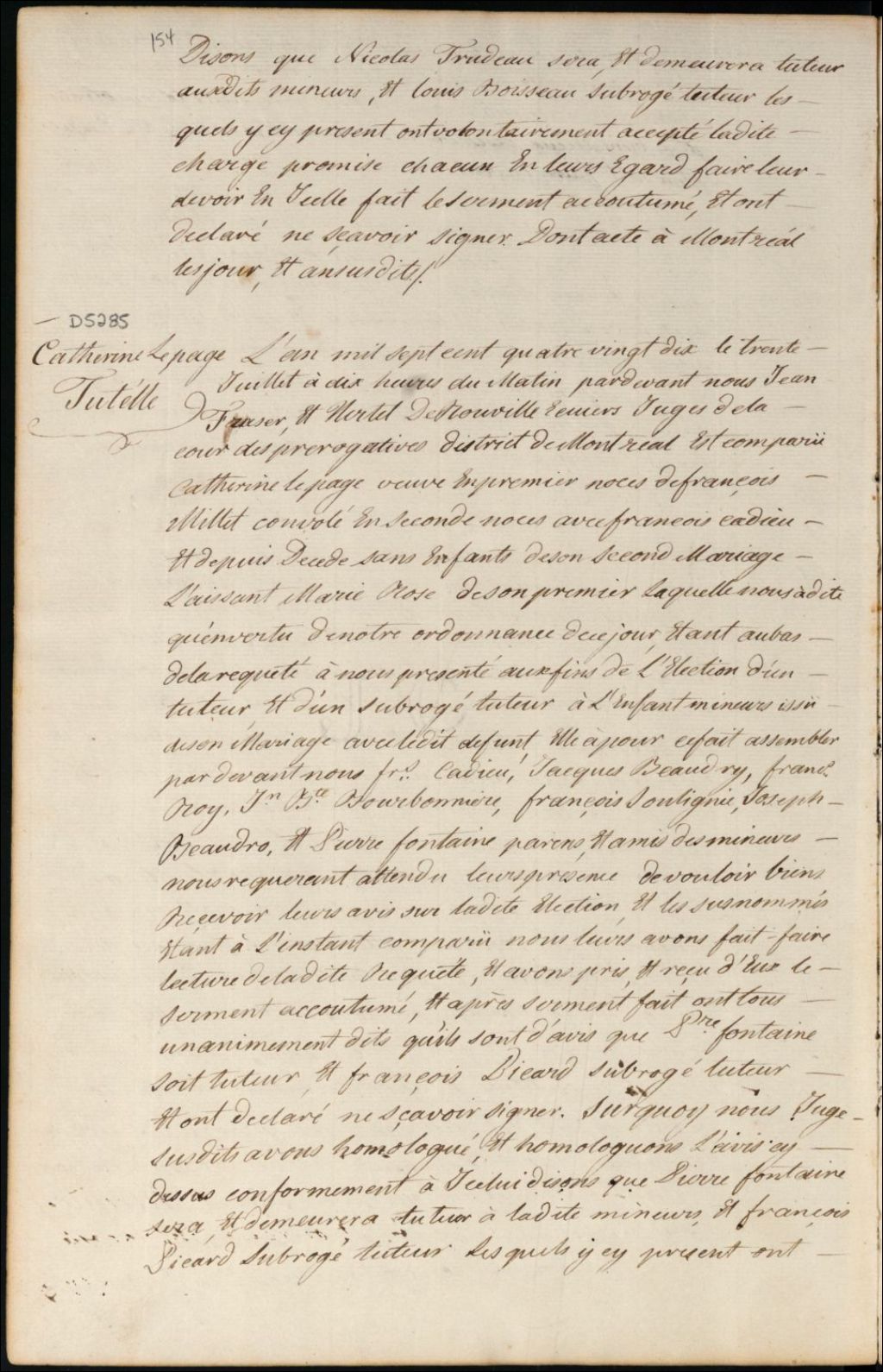 Tutelle de l'enfant mineur de défunt François Millet et de Catherine Lepage, 30 juillet 1790, Archives nationales à Montréal, Fonds Cour supérieure. District judiciaire de Montréal. Procédures en matières non contentieuses, (06M,CP601,S5,D5285).