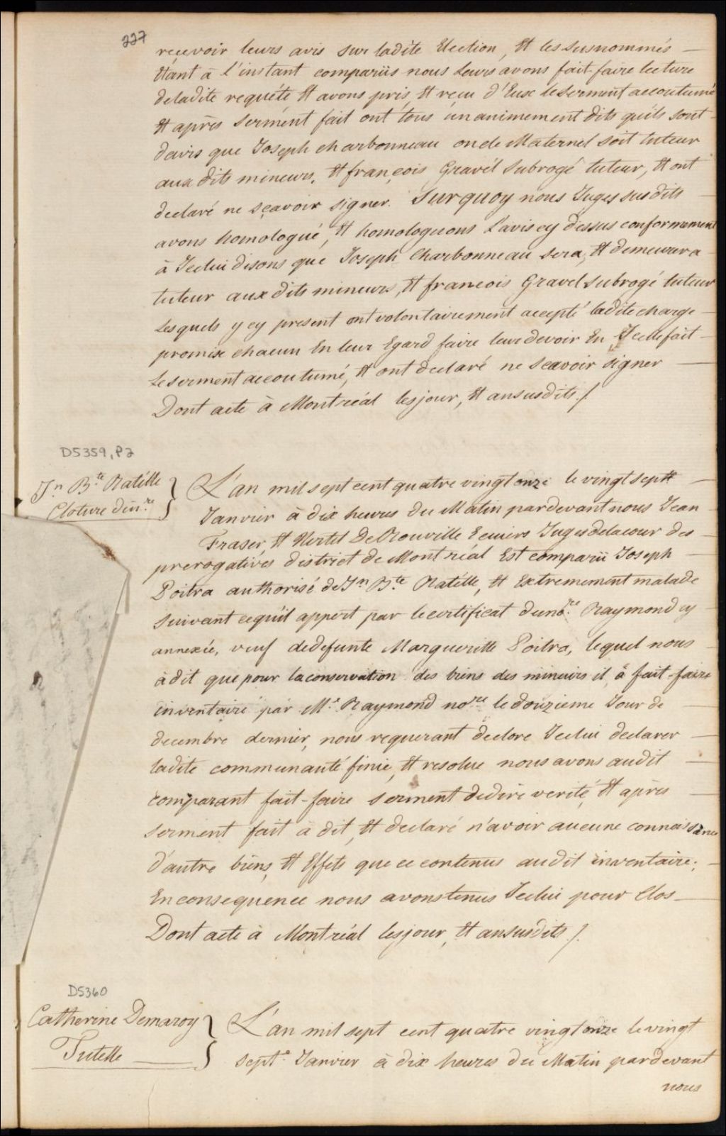 Tutelle des enfants mineurs de feu Joseph Mirau [Joseph Mireault] Sait-Jacques et de Catherine Desmarais, 27 janvier 1791, Archives nationales à Montréal, Fonds Cour supérieure. District judiciaire de Montréal. Procédures en matières non contentieuses, (06M,CP601,S5,D5360).