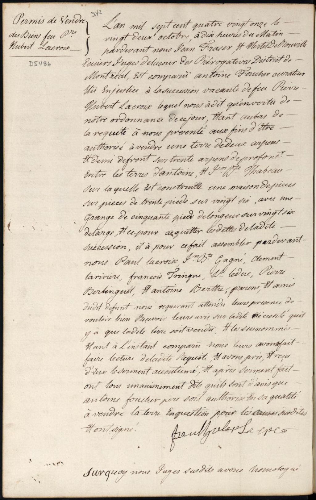 Curatelle de la succession vacante de feu Pierre Hubert Lacroix, 22 octobre 1791, Archives nationales à Montréal, Fonds Cour supérieure. District judiciaire de Montréal. Procédures en matières non contentieuses, (06M,CP601,S5,D5486).