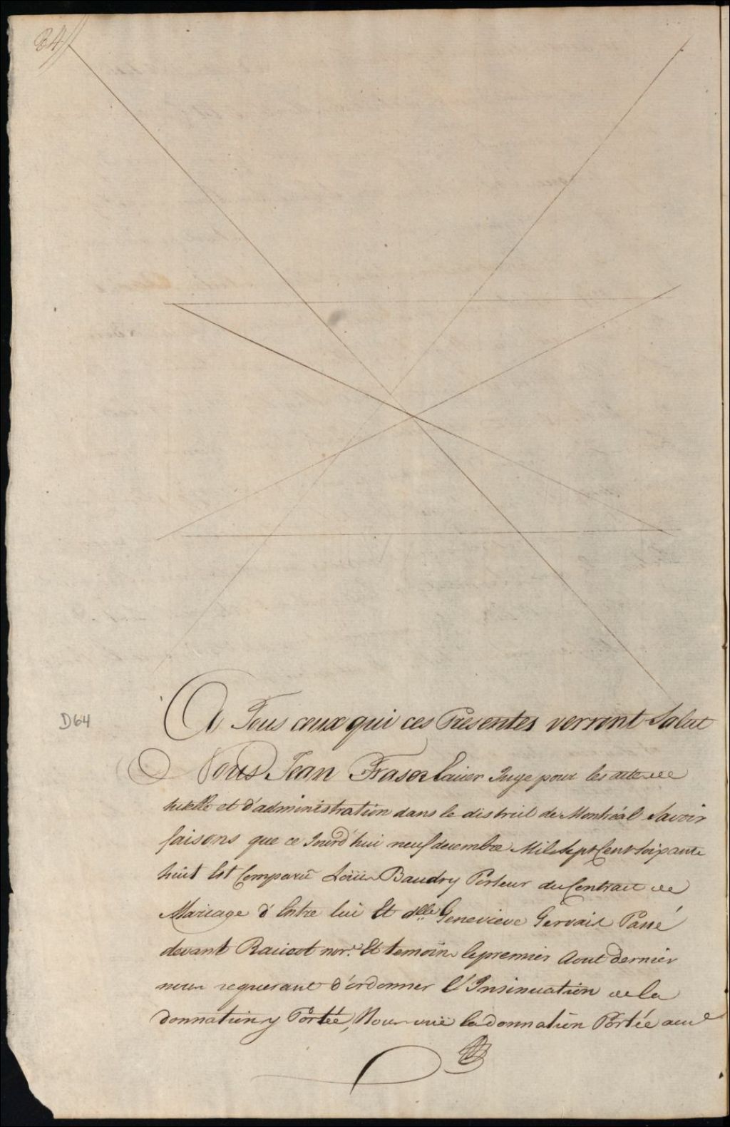 Insinuation de la donation portée au contrat de mariage entre Louis Beaudry et Geneviève Gervais, 9 décembre 1768, Archives nationales à Montréal, Fonds Cour supérieure. District judiciaire de Montréal. Procédures en matières non contentieuses, (06M,CP601,S5,D64).