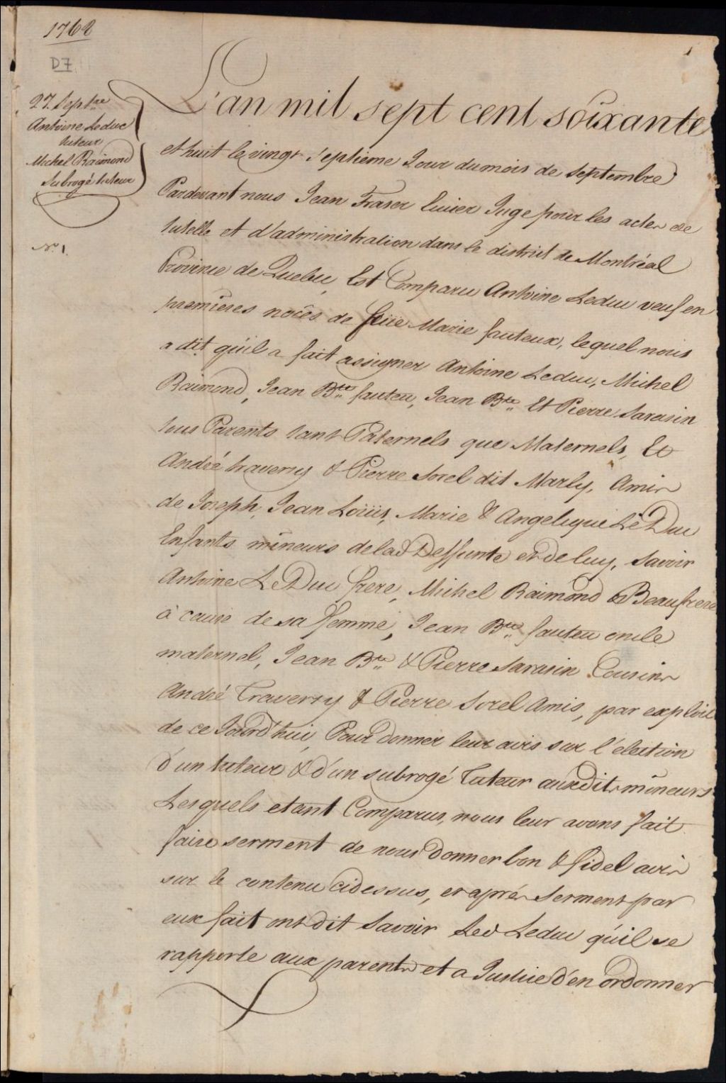 Tutelle des enfants mineurs de feu Marie Fauteux et d'Antoine Leduc, 27 septembre 1768, Archives nationales à Montréal, Fonds Cour supérieure. District judiciaire de Montréal. Procédures en matières non contentieuses, (06M,CP601,S5,D7).