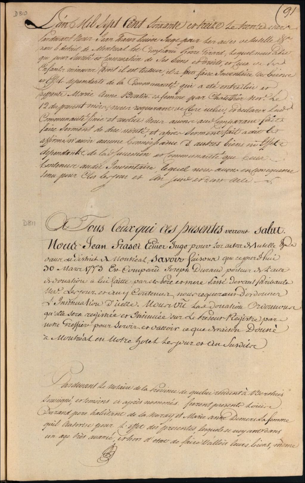- Insinuation de la donation de Louis Durand et de son épouse, Marie Anne Demers, à leurs fils, Joseph Durand
