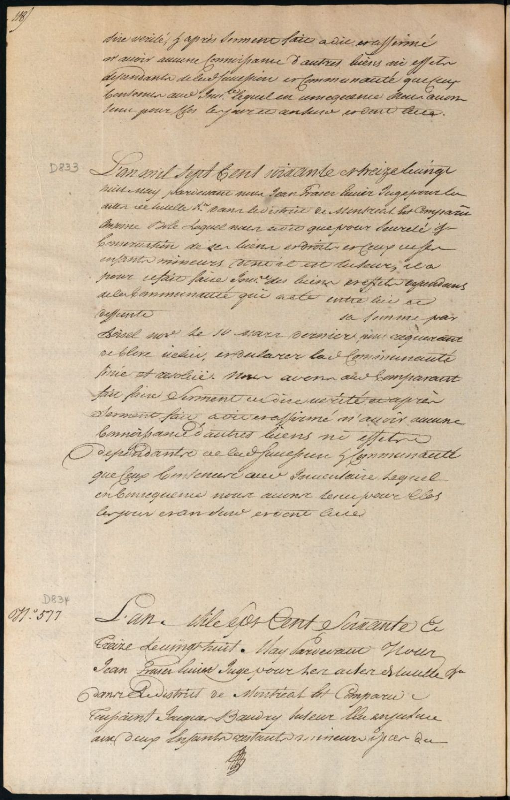Tutelle des enfants mineurs de feu Louis Beaudry et de Charlotte Janot, 28 mai 1773, Archives nationales à Montréal, Fonds Cour supérieure. District judiciaire de Montréal. Procédures en matières non contentieuses, (06M,CP601,S5,D834).