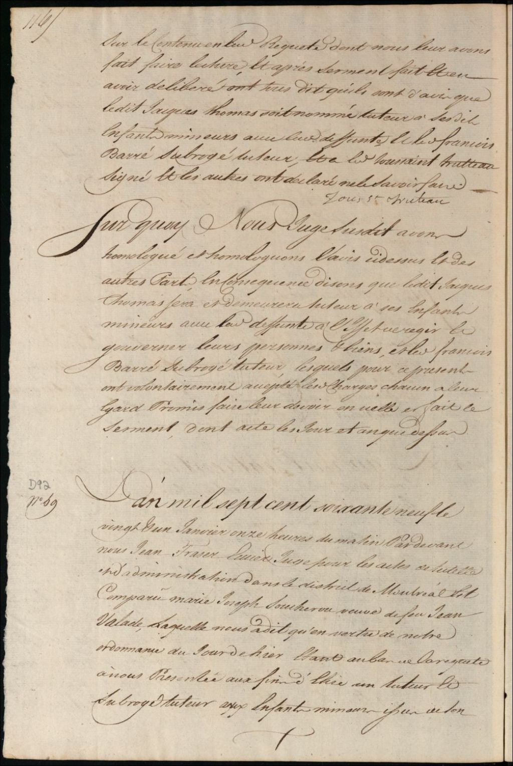Tutelle des enfants mineurs de feu Jean Valade et de Marie Josèphe Souchereau, 21 janvier 1769, Archives nationales à Montréal, Fonds Cour supérieure. District judiciaire de Montréal. Procédures en matières non contentieuses, (06M,CP601,S5,D92).