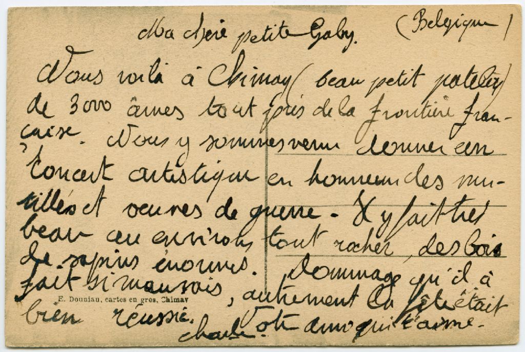 - Les cartes postales représentent Chimay en Belgique. Au verso de la carte, Charles de Bruyne fait mention de concerts donnés en l'honneur des mutilés, des veuves et des orphelins de la guerre 14-18