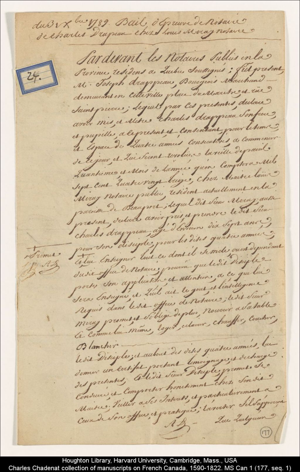 Bail d'épreuve de notaire (Apprentissage) par lequel Joseph Drapeau, marchand bourgeois de Québec, place Charles Drapeau, son frère âgé d'environ 17 ans et pupille, chez Louis Miray, notaire demeurant à Beauport, comme disciple pour quatre ans, 31 décembre 1789, Archives nationales à Québec, Collection Charles Chadenat collection of manuscripts on French Canada (MS Can 1), (03Q,ZE25,P177).
