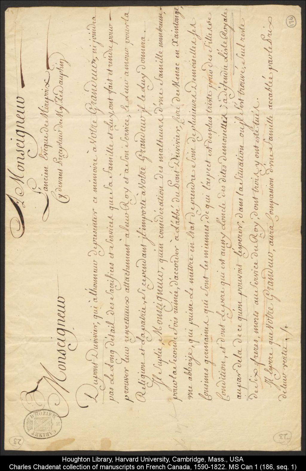 - Supplique de l'abbé Dupont Duvivier, curé de Messac en Saintonge, adressée à l'ancien évêque de Mirepoix, précepteur de monseigneur le Dauphin, afin qu'il accorde un abbaye audit Duvivier, ce qui lui permettrait d'améliorer sa condition et celle de sa famille qui frôle la ruine