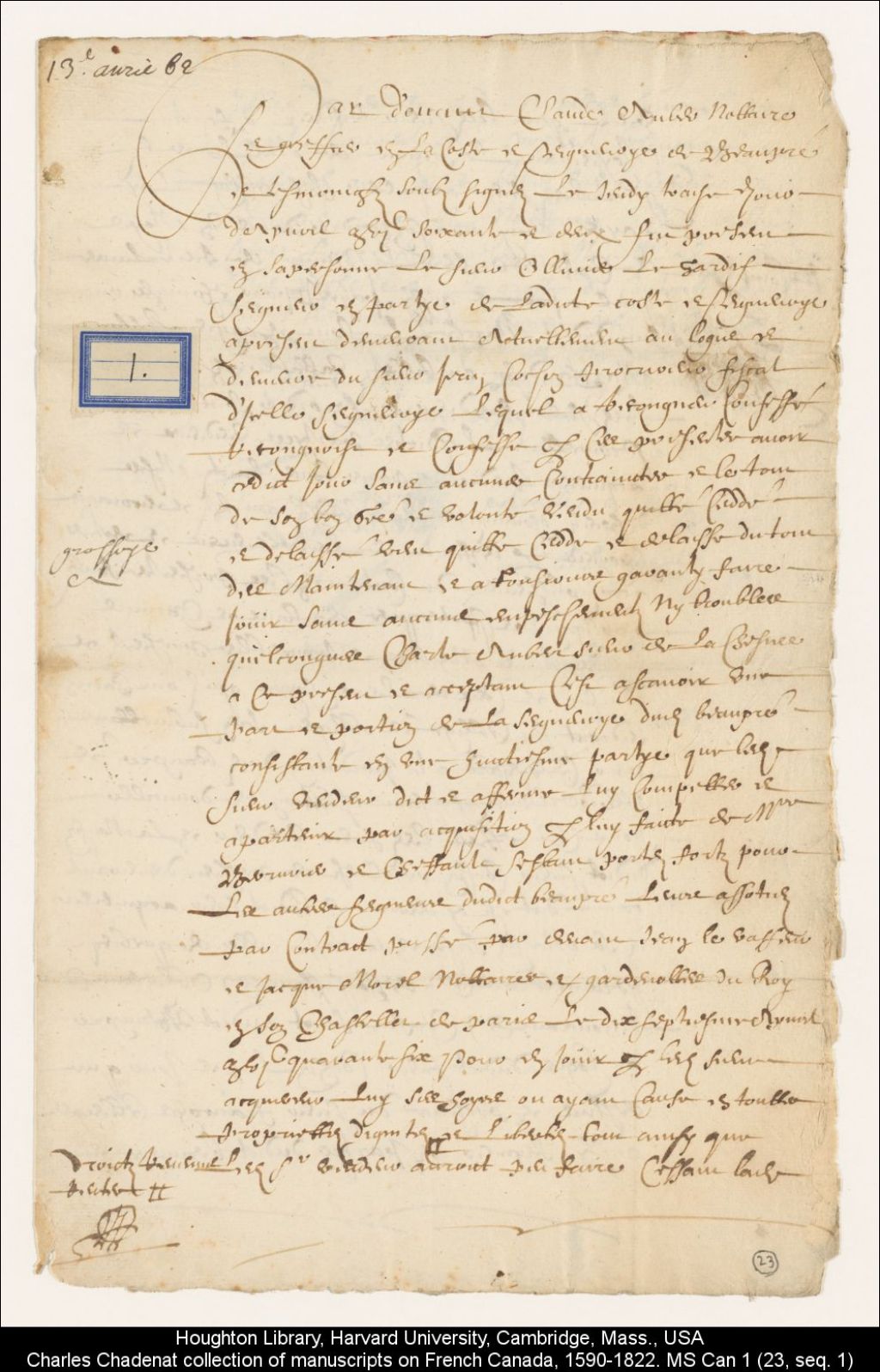 Vente par Olivier Letardif, seigneur en partie de la côte et seigneurie de Beaupré, à Charles Aubert de Lachenaie d'un huitième de la seigneurie de Beaupré, 13 avril 1662, Archives nationales à Québec, Collection Charles Chadenat collection of manuscripts on French Canada (MS Can 1), (03Q,ZE25,P23).