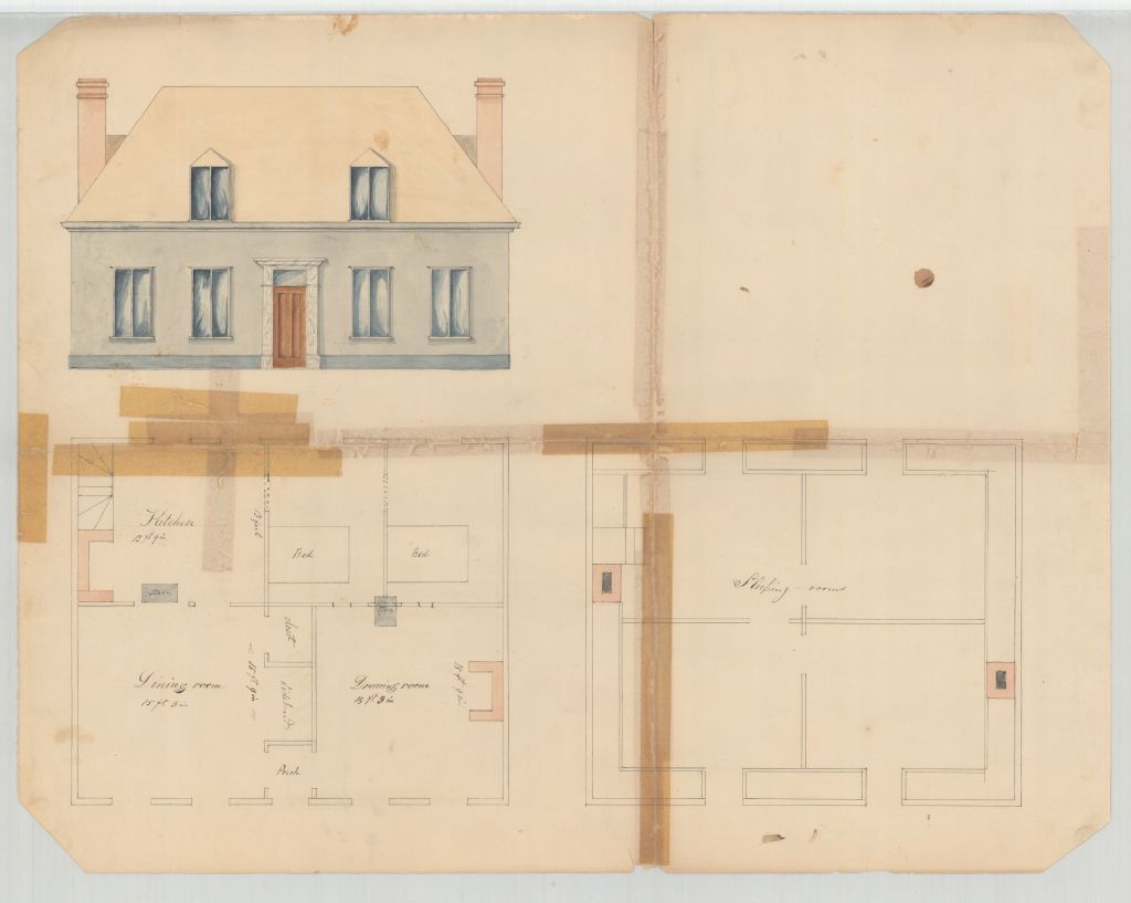 Plan d'architecture d'une résidence située sur le chemin de la Canardière dans la seigneurie de Notre-Dame-des-Anges. Ce dessin comprend une élévation et un plan