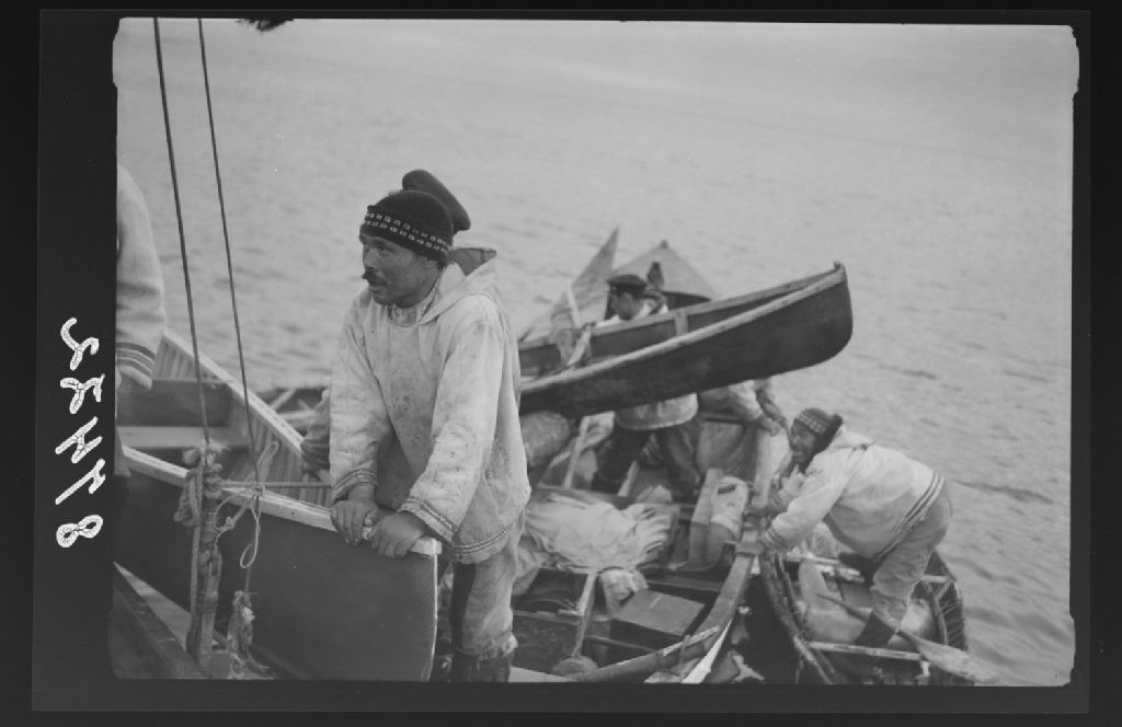 Expédition de Jacques Rousseau à la baie d'Ungava - [Inuits] embarquant dans une goélette Peterhead après avoir chassé le phoque en kayaks et en d'autres petites embarcations