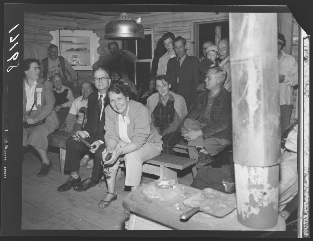 Mademoiselle Marie-Jeanne Gagnon à l'avant-plan ainsi que quelques délégués du Conseil Canadien. Club Chasse & Pêche des Employés Civils, 1951, Archives nationales à Québec, Fonds Ministère de la Culture et des Communications, (03Q,E6,S7,SS1,D2,P89161), Neuville bazin.