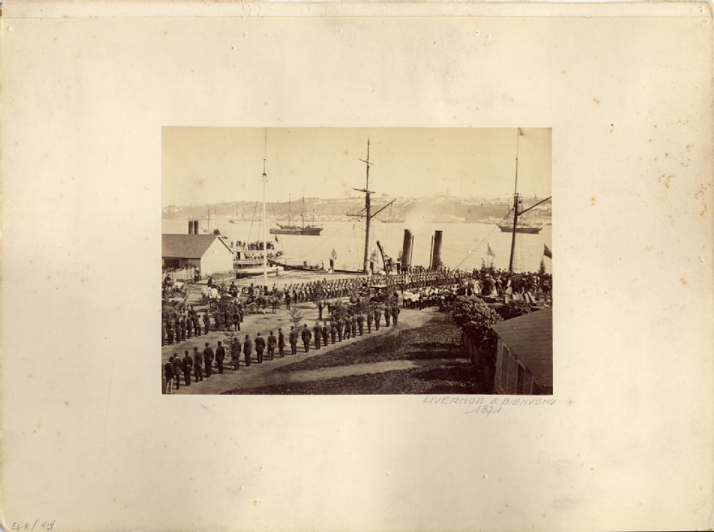 Québec-Québec - Départ des troupes de l'armée britannique le 11 novembre 1871, [11 novembre 1871], Archives nationales à Québec, Fonds Ministère de la Culture et des Communications, (03Q,E6,S8,SS6,P414), Livernois & Bienvenu.