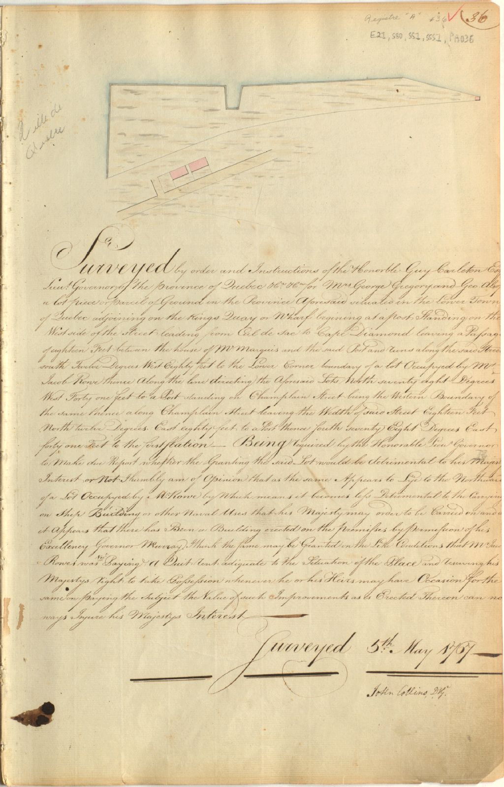 Sur ce plan d'un lot de Saint-Pierre, ville de Québec, figurent la rue du Cul-de-Sac, le Quai du Roi ou King's Wharf, le lot de grève, le quai, les bâtiments, les rues et les noms George Grégory, George Alsopp, M. Marquis et John Rowe