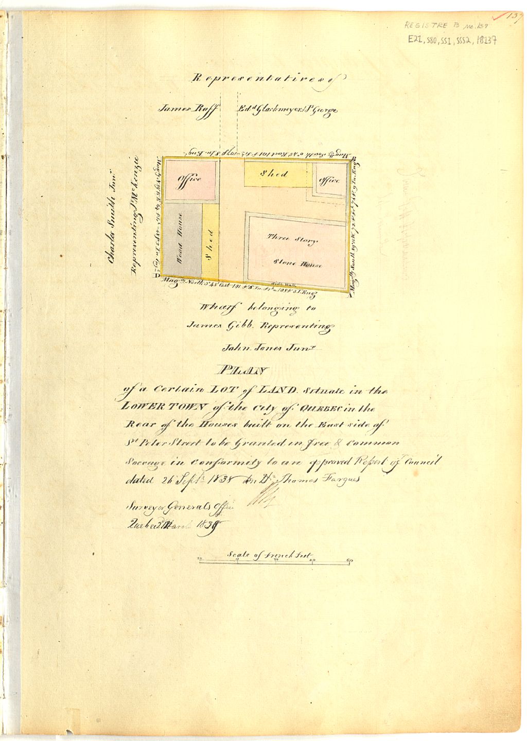 Sur ce plan d'un lot de Saint-Pierre, ville de Québec, figurent la rue Saint-Pierre, le bâtiments, le quai, la maison de bois, la maison de pierre, le hangar et le bureau. On y retrouve également les noms Charles Smith fils, James Ruff, Edward Glackmeyer, P. George et James Gibb représentant de John Jones