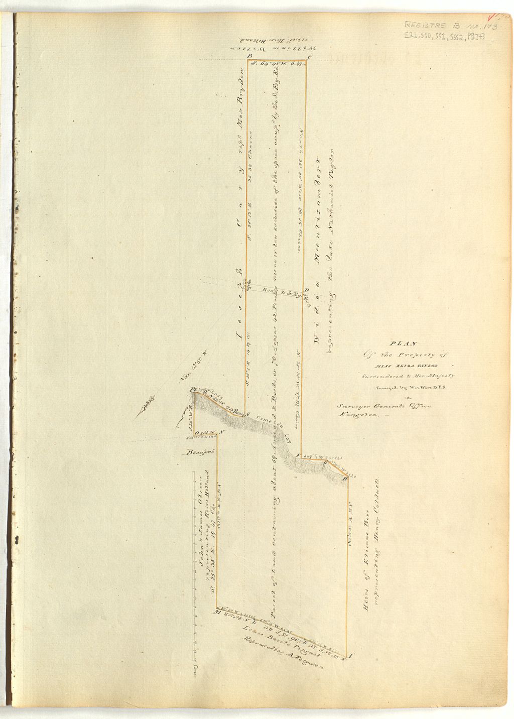Plan of the property of Miss Eliza Taylor surrendered to Her Majesty, situate on the road leading to St. Foy in the banlieu of the City of Quebec.