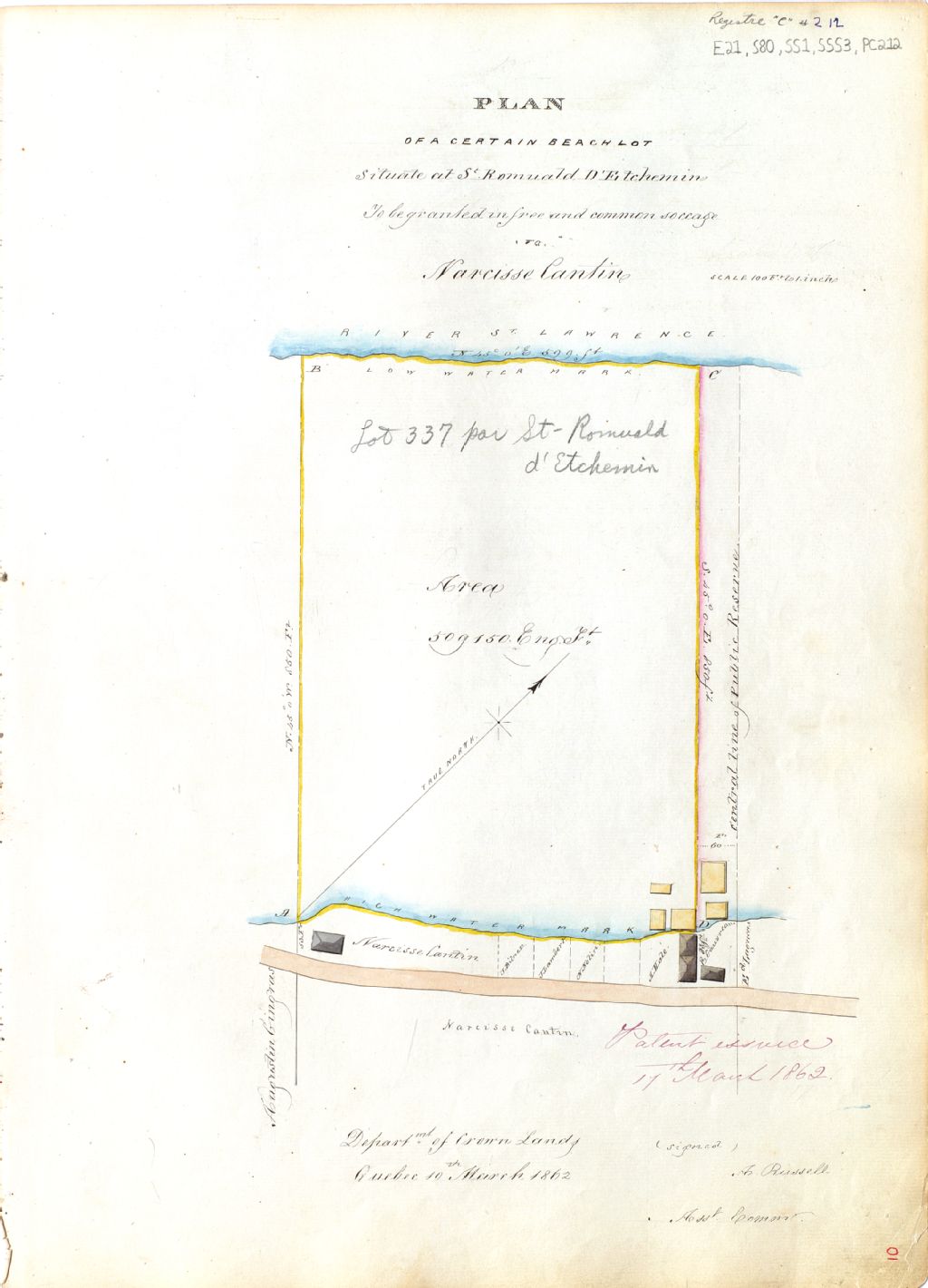 Plan of a certain beach lot situate at St-Romuald to be granted in free and common soccage to Narcisse Cantin.