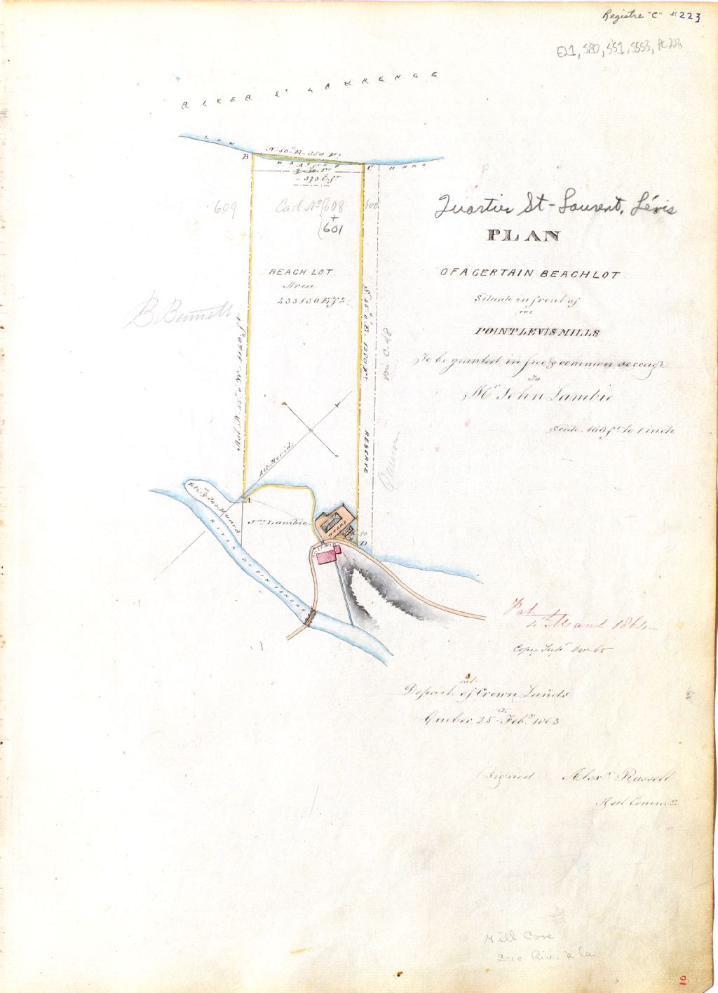 Plan of a certain beach lot situate in front of the Point Levy Mills, to be granted in free and common soccage to Mr. John Lambie.
