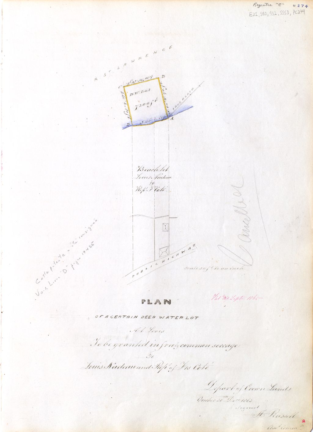 Plan of a certain deep water lot at Lévis to be granted in free and common soccage to Louis Nadeau and the representative Côté Brothers